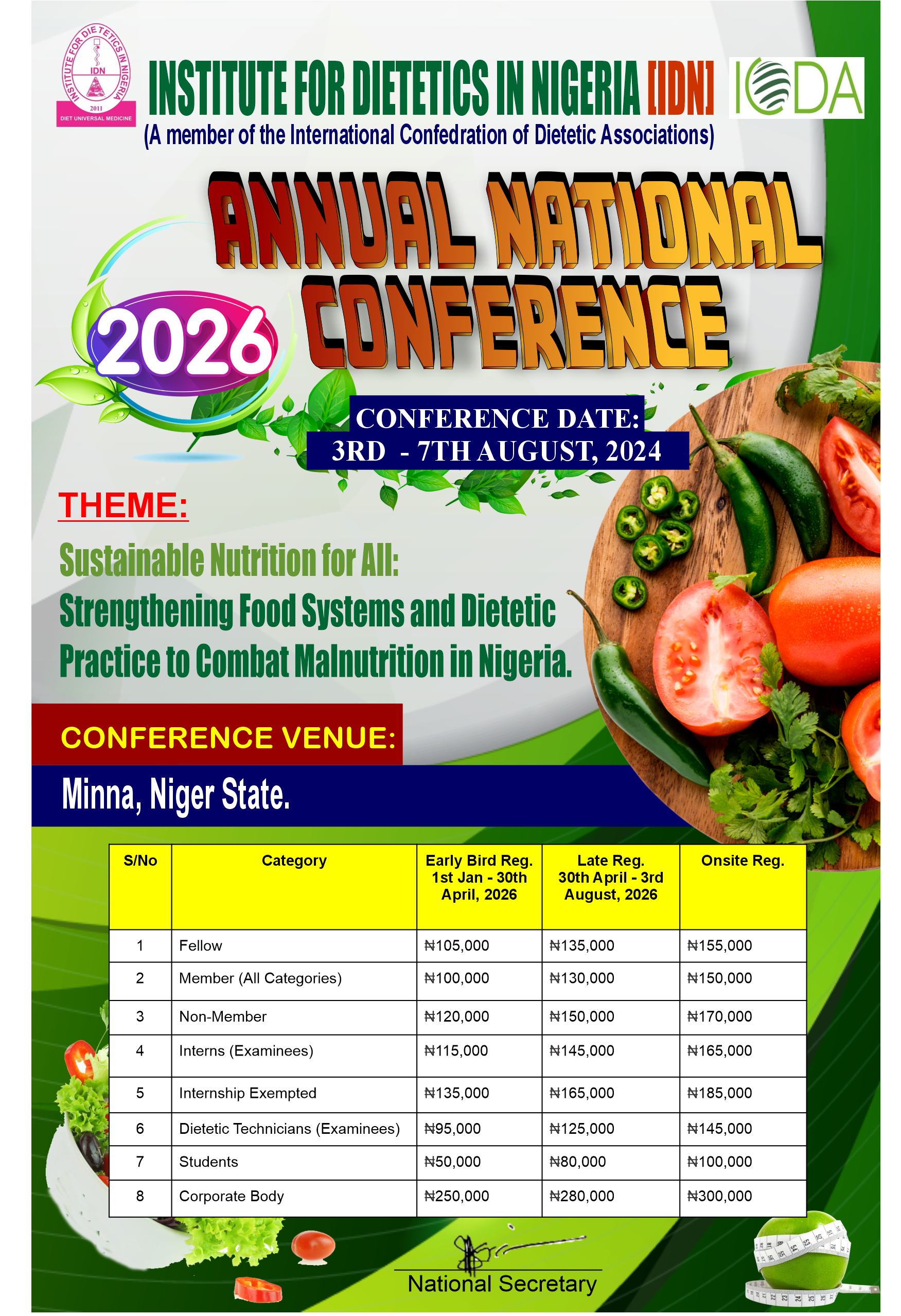 INSTITUTE FOR DIETETICS IN NIGERIA (IDN) (Also known as the Association of Nigerian Dietitians, AND) President of IDN/AND Commends Senate for Passage of the Dietitians Council of Nigeria (Establishment) Bill The President of the Institute for Dietetics in Nigeria (IDN) and the Association of Nigerian Dietitians (AND), Tajudeen Olutope Ahmed, Esq., FIDN, has commended the […]